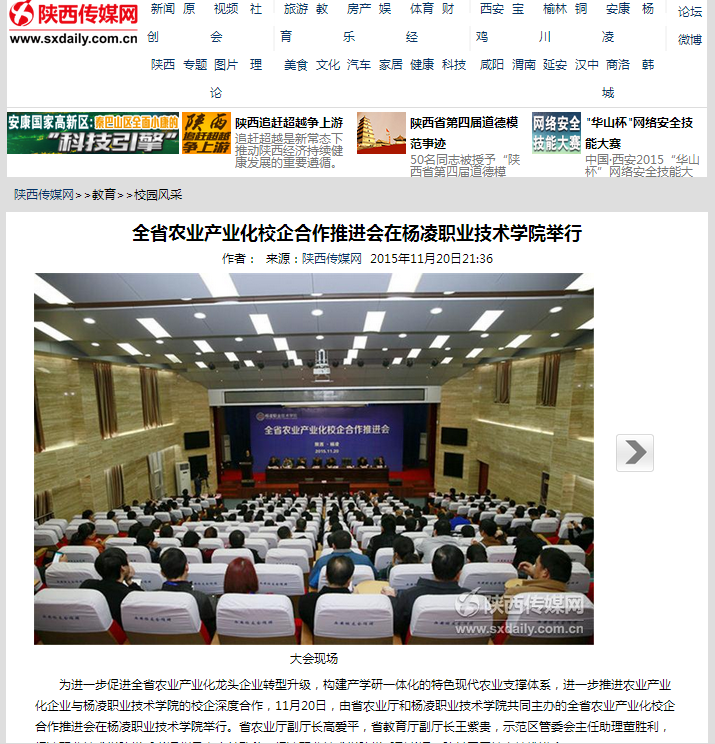 为进一步促进全省农业产业化龙头企业转型升级,构建产学研一体化的特色现代农业支撑体系,进一步推进农业产业化企业与杨凌职业技术学院的校企深度合作,11月20日,由省农业厅和杨凌职业技术学院共同主办的全省农业产业化校企合作推进会在杨凌职业技术学院举行。省农业厅副厅长高爱平,省教育厅副厅长王紫贵,示范区管委会主任助理董胜利,杨凌职业技术学院党委书记赵曼出席并致辞,杨凌职业技术学院党委副书记、院长王周锁主持推进会。