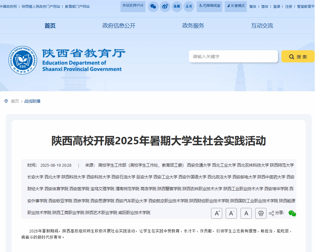 2025年暑假期间,陕西高校组织师生积极开展社会实践活动,让学生在实践中受教育、长才干、作贡献,引领学生立志做有理想、敢担当、能吃苦、肯奋斗的新时代好青年。