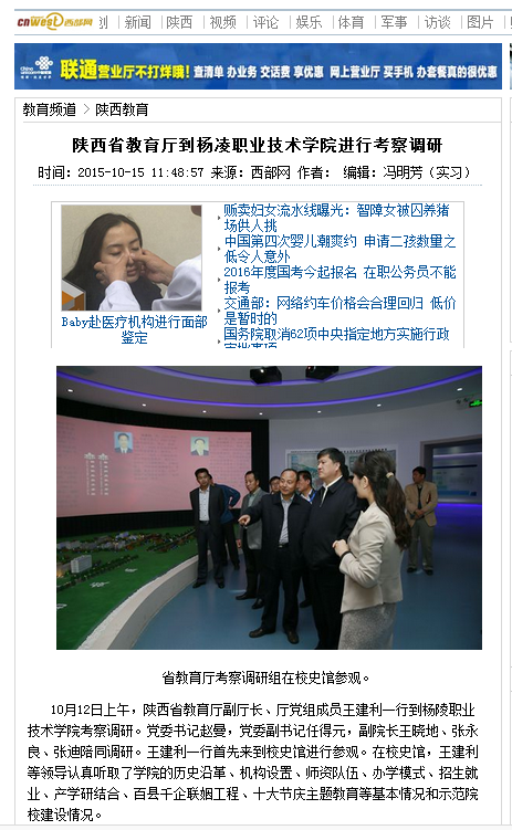10月12日上午,陕西省教育厅副厅长、厅党组成员王建利一行到杨陵职业技术学院考察调研。党委书记赵曼,党委副书记任得元,副院长王晓地、张永良、张迪陪同调研。王建利一行首先来到校史馆进行参观。在校史馆,王建利等领导认真听取了学院的历史沿革、机构设置、师资队伍、办学模式、招生就业、产学研结合、百县千企联姻工程、十大节庆主题教育等基本情况和示范院校建设情况。