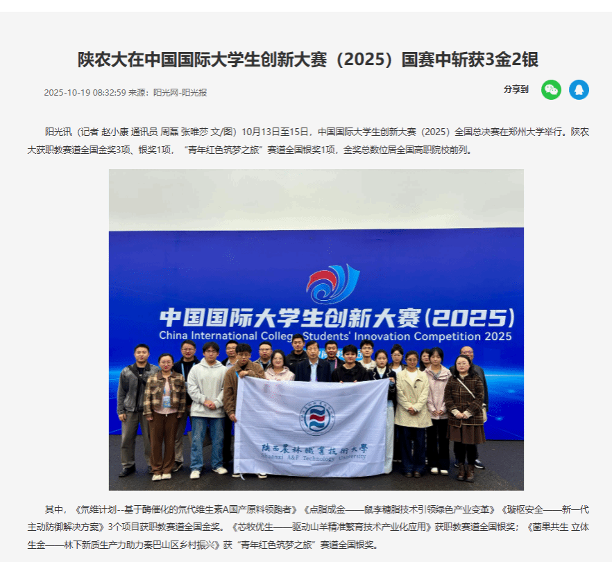 阳光讯(记者 赵小康 通讯员 周磊 张唯莎 文/图)10月13日至15日,中国国际大学生创新大赛(2025)全国总决赛在郑州大学举行。陕农大获职教赛道全国金奖3项、银奖1项,“青年红色筑梦之旅”赛道全国银奖1项,金奖总数位居全国高职院校前列。