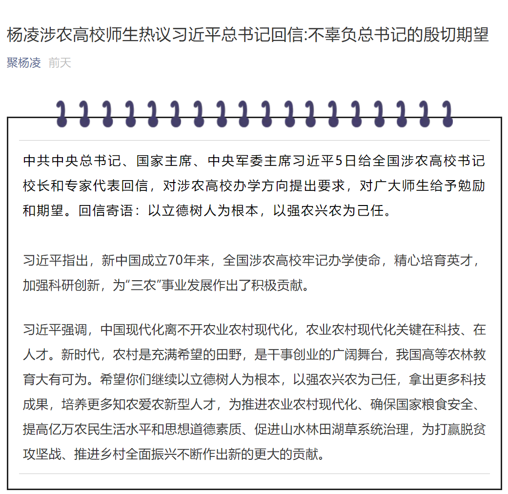 在这振奋人心的时刻,9月7日,习近平总书记的回信立刻在杨凌示范区内两所高校——西北农林科技大学、杨凌职业技术学院师生中引发强烈反响。