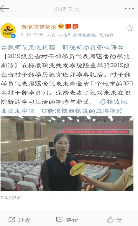 #教师节里送祝福 职院新学员寄心语# 【2019级全省村干部学员代表周竑含的学业期待】在杨凌职业技术学院隆重举行2019级全省村干部学历教育班开学典礼后,村干部学员代表周竑含代表来自全省11个地市的325名村干部学员们,深情表达了她对未来在职院新的学习生活的期待与希望。 @杨凌职业技术学院