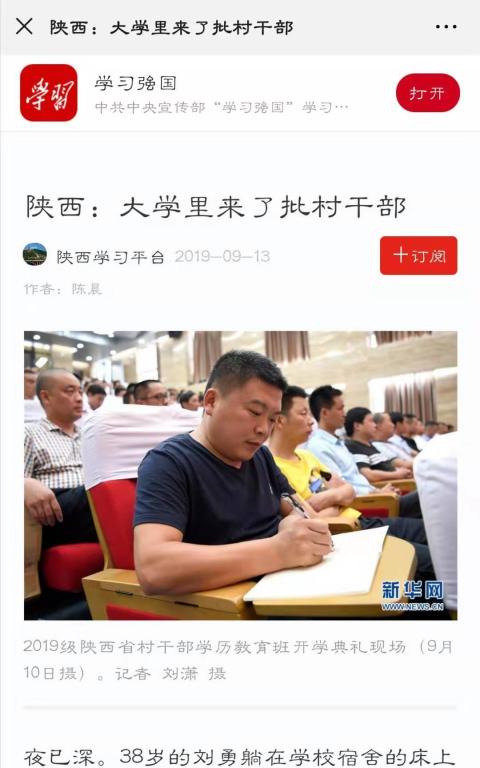 几个小时之后,9月10日上午,刘勇出现在了陕西杨凌职业技术学院的大礼堂内。这是2019级陕西省村干部学历教育班开学典礼的现场,能容纳300多人的礼堂座无虚席。刘勇和同学们热情寒暄,不时拿起手机自拍。他们都是大一新生,又有一个共同的身份——村干部。