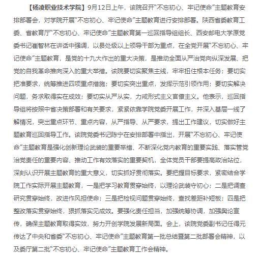 9月12日上午,该院召开“不忘初心、牢记使命”主题教育安排部署会,对学院开展“不忘初心、牢记使命”主题教育进行安排部署。陕西省委教育工委、省教育厅“不忘初心、牢记使命”主题教育第一巡回指导组组长、西安邮电大学原党委书记崔智林在讲话中强调,以县处级以上领导干部为重点,在全党开展“不忘初心、牢记使命”主题教育,是党的十九大作出的重大决策,是推动全面从严治党向纵深发展、把党的自我革命推向深入的重大举措。该院要切实聚焦主线,牢牢扭住根本任务;要切实把准要求,统筹推进四项重点措施;要切实突出重点,发挥示范引领作用;要切实解决问题,务求取得实在成效;要切实从严从实,力戒形式主义官僚主义。他表示,巡回指导组将按照中省决策部署和有关要求,紧紧依靠学院党委开展工作,并深入基层一线了解情况,突出重点环节、重点内容,从严指导、从严要求,提出工作建议,切实做好主题教育巡回指导工作。该院党委书记陈宁在安排部署中指出,开展“不忘初心、牢记使命”主题教育是强化创新理论武装的重要举措、不断深化党内教育的重要实践、落实管党治党责任的重要内容、推动工作有效落实的重要契机,全体党员干部要提高政治站位,深刻认识开展主题教育的重大意义,切实抓好贯彻落实。要把握目标要求,紧密结合学院工作实际开展主题教育,一是把学习教育贯穿始终,以理论武装守初心;二是把调查研究贯穿始终,改进作风担使命;三是把检视问题贯穿始终,查找差距补短板;四是把整改落实贯穿始终,狠抓落实见成效。要强化责任担当,加强统筹协调,加强舆论宣传,确保主题教育取得实效,努力开创学院发展新局面。会上,该院党委副书记任得元传达了中央和省委“不忘初心、牢记使命”主题教育第一批总结暨第二批部署会精神,以及委厅第二批“不忘初心、牢记使命”主题教育工作会精神。