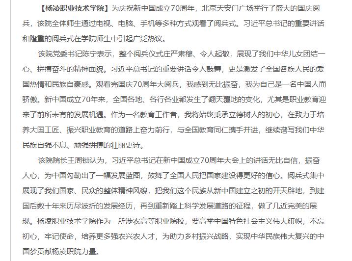 该院院长王周锁认为,习近平总书记在新中国成立70周年大会上的讲话无比自信,振奋人心,为中国勾勒出了一幅发展蓝图,鼓舞了全国人民把国家建设得更好的信心。阅兵式集中展现了我们国家、民众的整体精神风貌,把我们这个民族从新中国建立之初的开天辟地,到建国后数十年来历尽波折的发展经历,再到重新踏上科学发展道路的征程,做了几近完美的展现。杨凌职业技术学院作为一所涉农高等职业院校,要高举中国特色社会主义伟大旗帜,不忘初心,牢记使命,培养更多强农兴农人才,为助力乡村振兴战略,实现中华民族伟大复兴的中国梦贡献杨凌职院力量。