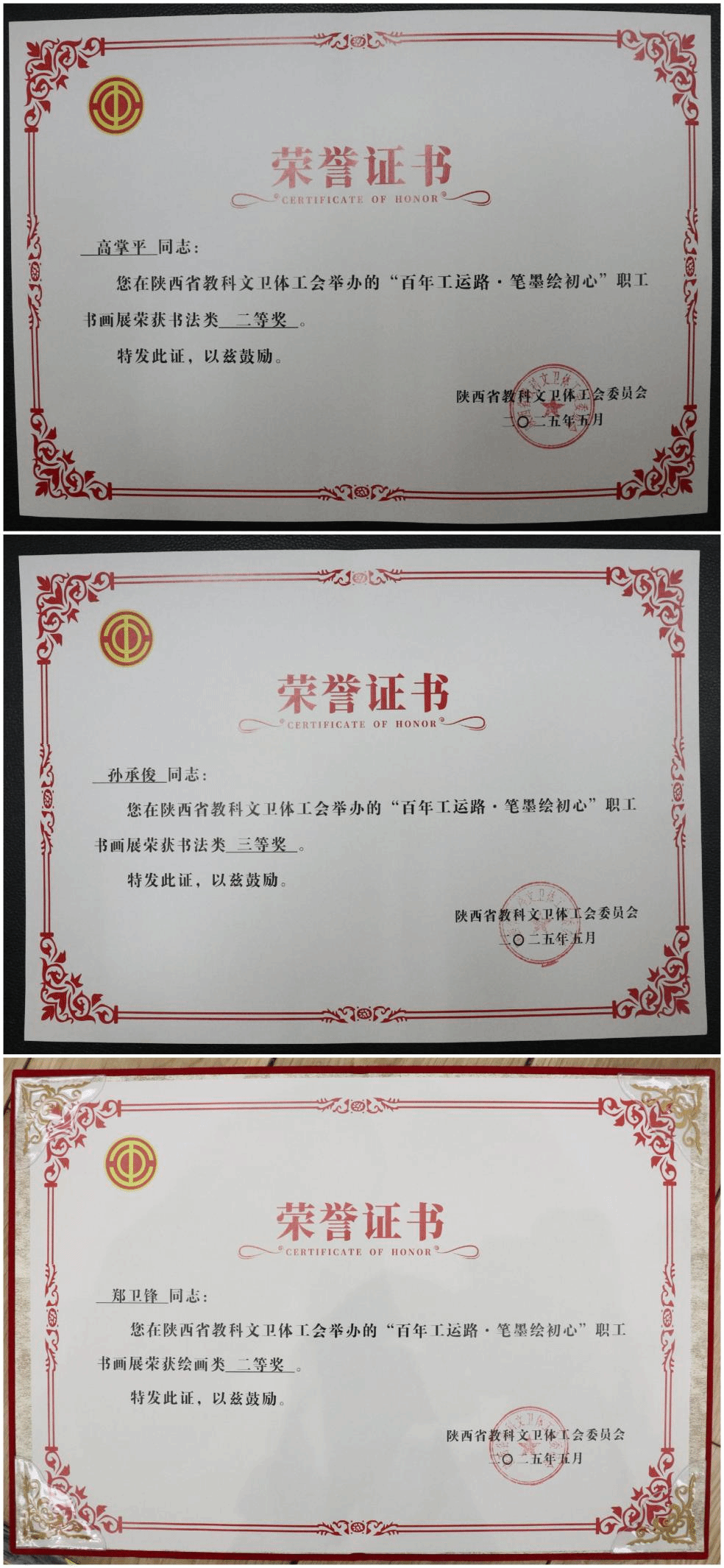 近日,为庆祝中华全国总工会成立100周年,“百年工运路·笔墨绘初心”陕西省教科文卫体系统职工书画展在陕西省图书馆盛大开幕。我校工会积极响应,选派3名教职工参赛,获得佳绩。高掌平、孙承俊作品分别获书法类二等奖、三等奖,郑卫锋作品获绘画类二等奖。